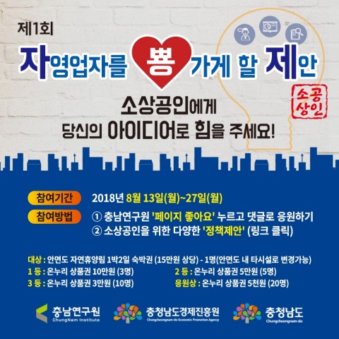 ¹Ú°ÇÈ­ ±âÀÚ/ Ãæ³²¿¬±¸¿øÀÌ ¿À´Â 27ÀϱîÁö ¿¬±¸¿ø ÆäÀ̽ººÏÀ» ÅëÇØ ¼Ò»ó°øÀÎ(ÀÚ¿µ¾÷ÀÚ)À» À§ÇÑ ¾ÆÀ̵ð¾î °ø¸ðÀ̺¥Æ® ¡®ÀÚ¿µ¾÷ÀÚ¸¦ »Ð °¡°Ô ÇÒ Á¦¾È(¾àĪ: ÀÚ»ÐÁ¦)¡¯À» ½Ç½ÃÇÑ´Ù°í ¹àÇû´Ù.